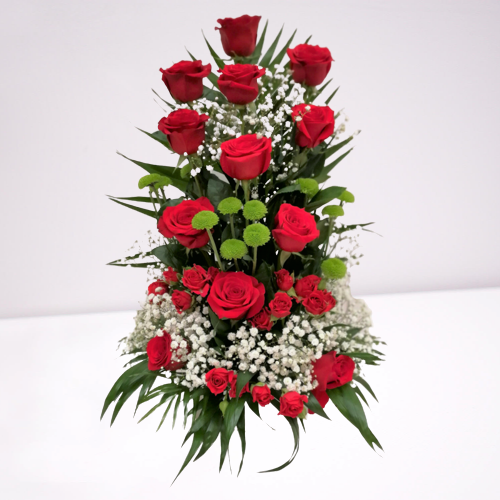 Centro de rosas rojas con botón verde y verdes variados. Puedes completar tu pedido con un peluche o un pin.