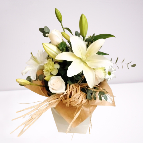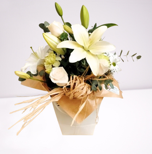 Las cajas de flores son tendencia y Poblaflor lo sabe. Por ello te ofrecemos esta elegante caja de flores variadas de la mejor calidad seleccionadas por nuestros floristas, en tonos blancos, que serán la delicia de aquella persona a la vayan destinadas.
