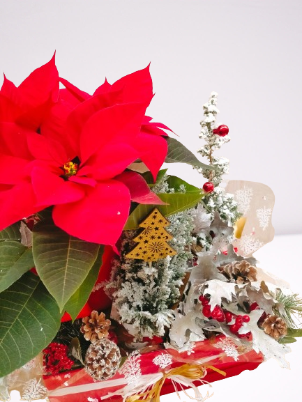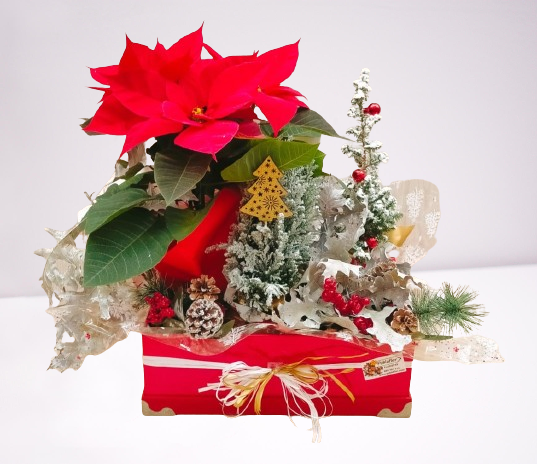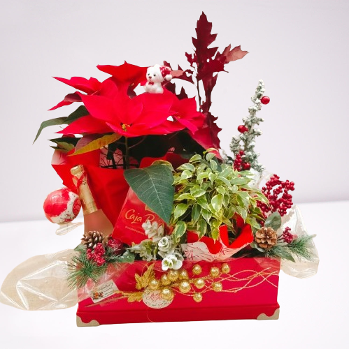 Caja decorada de plantas de temporada de navidad con un toque navideño.