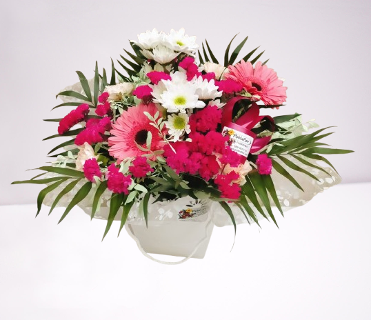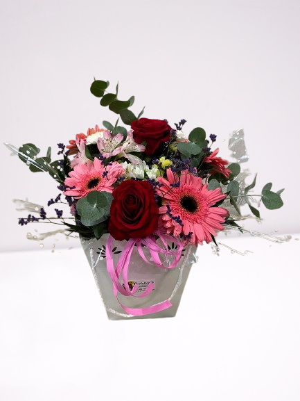 Arreglo de flor variada seleccionada por nuestros floristas, en tonos rosa, presentada en una elegante caja. Al ser un producto natural, las fotos son orientativas.