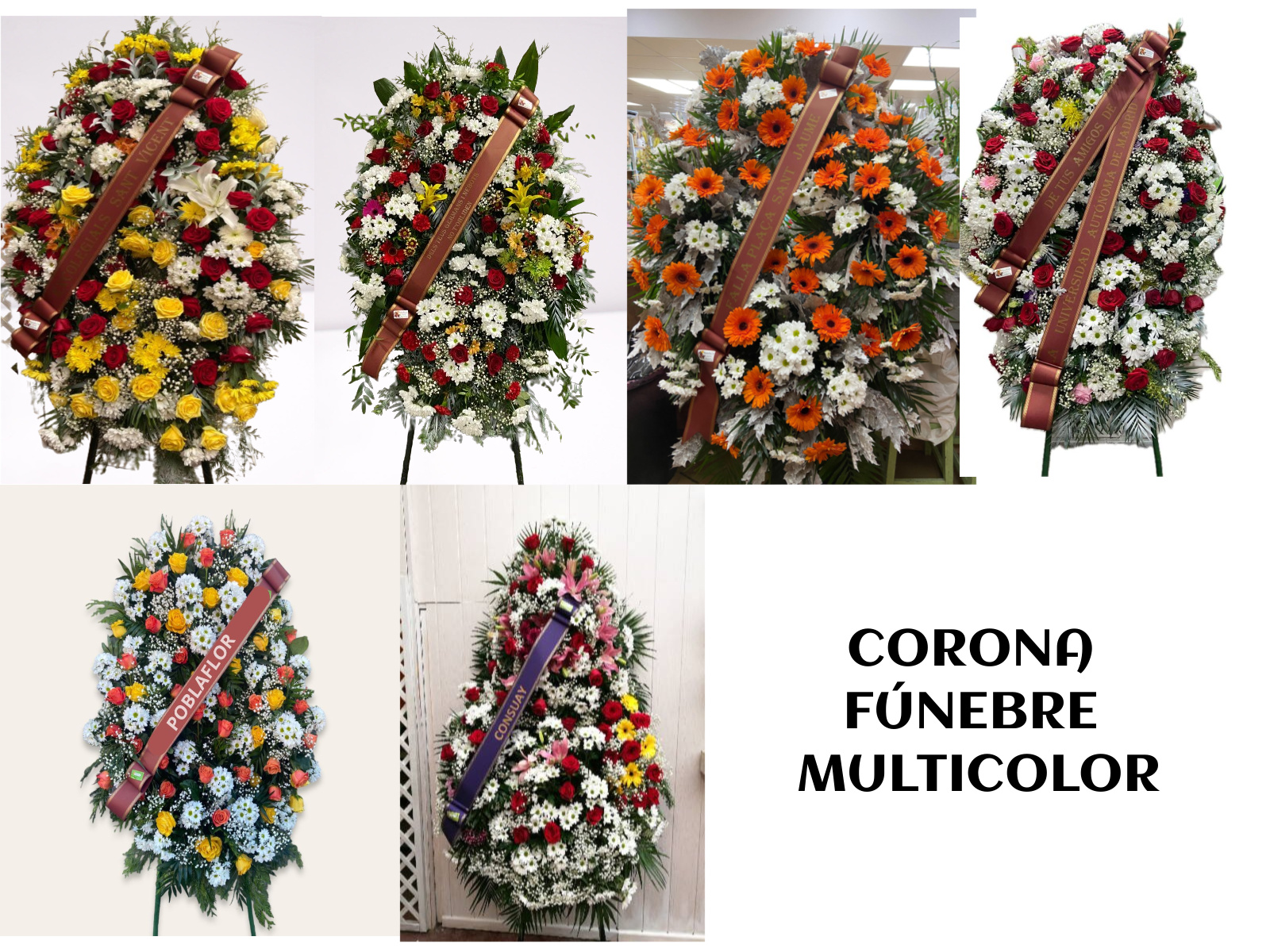 Corona fúnebre multicolor confeccionada con las mejores flores de temporada, seleccionadas por nuestros floristas. Y se puede elegir entre los diferentes presupuestos.