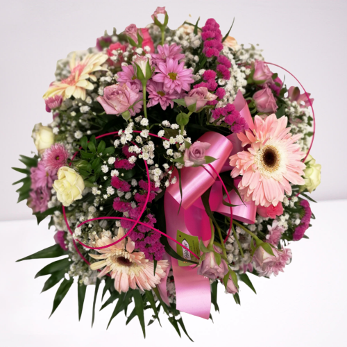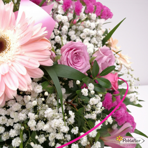 Centro de gerberas, margaritas, rosa pitiminí, statice y paniculata en tonos rosas y blancos.