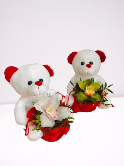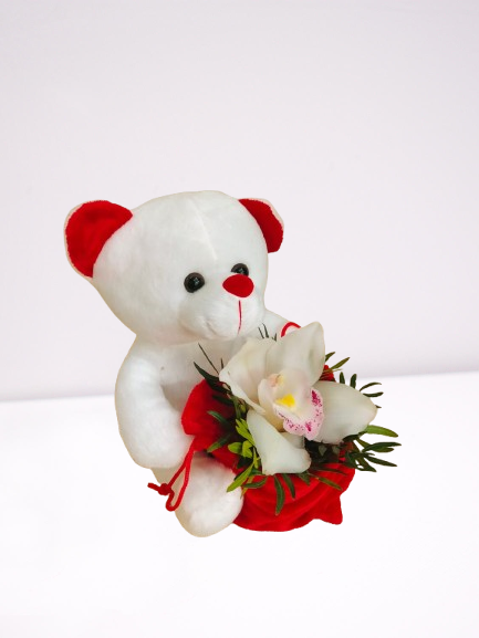 Oso de peluche acompañado por un orquídea blanca natural. Puedes añadirle un pin romántico, haz clic aquí.