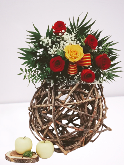 Clásico ramo de media docena de rosas, con cinco rojas y una amarilla con lazo de la señera.