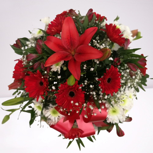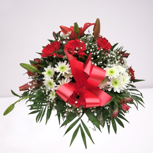Centro de flores variadas en tonos rojos y blancos. Puedes completar tu centro con un pelucheo un pin.