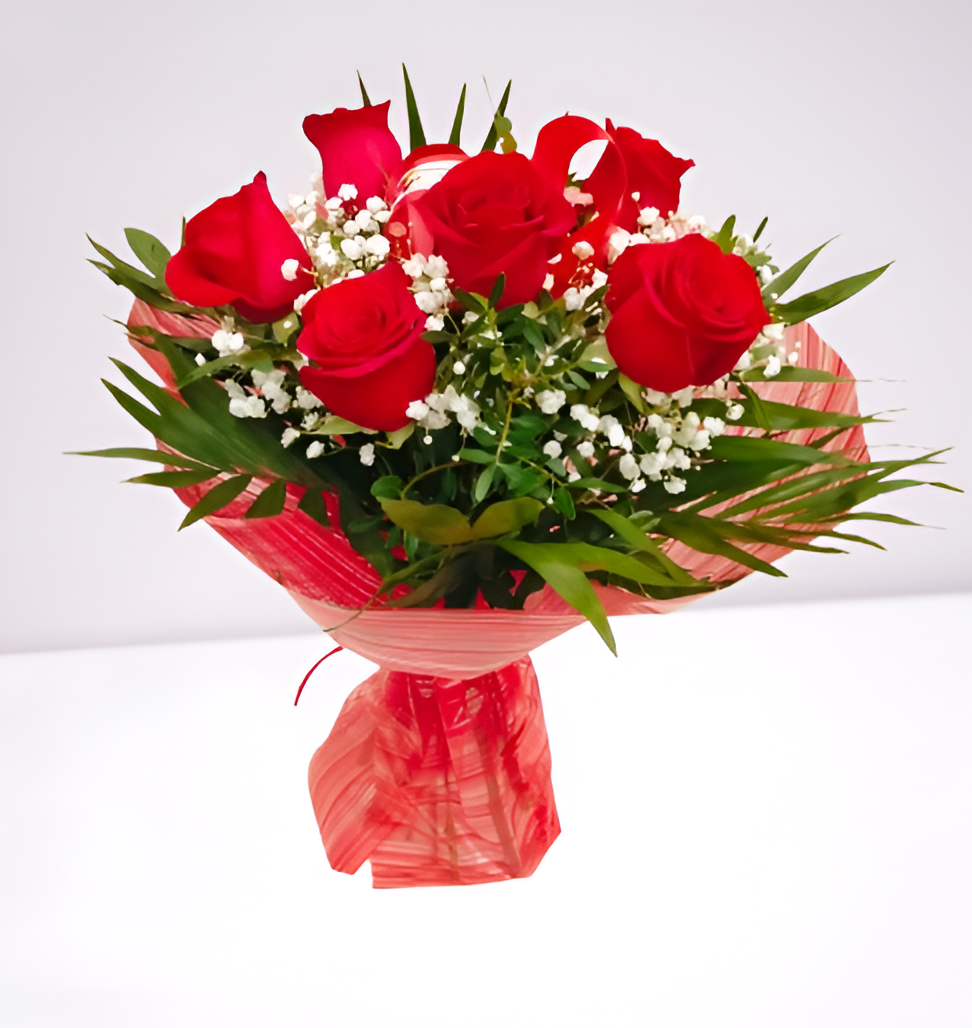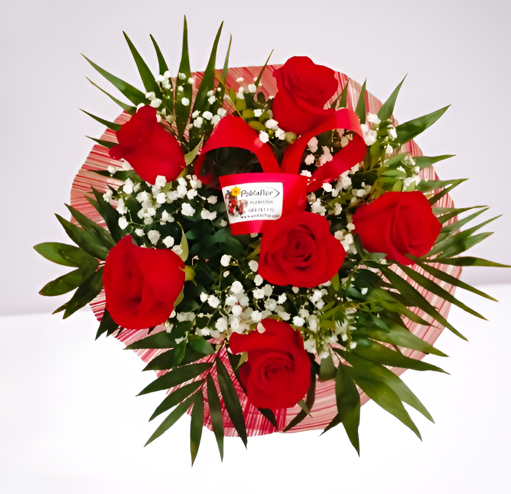 Este ramo distinguido y romántico de 6 rosas rojas es perfecto para ganar el corazón de esa persona tan especial o expresarle tu amor más genuino. Un arreglo floral atractivo y accesible complementado con un variado y elegante follaje verde y paniculata blanca.