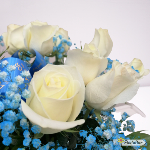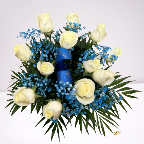 Este ramo de rosas blancas con paniculata azul es único y aporta un toque diferente a su día. La elección más adecuada para impresionar a alguien. ¡Hazle un obsequio inigualable!