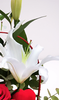 Un centro hecho en cesta de mimbre con rosas rojas freedom, lilium blanco y detalle romántico.